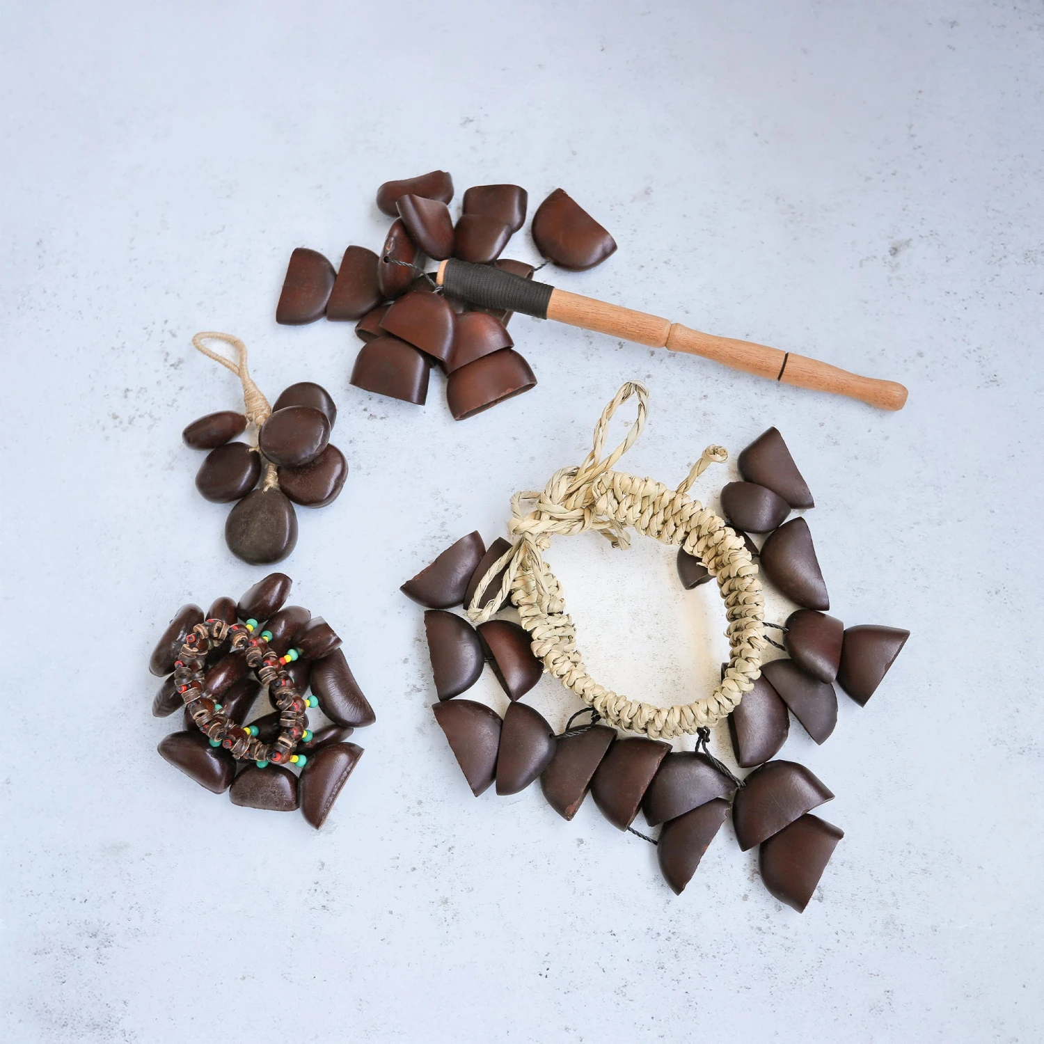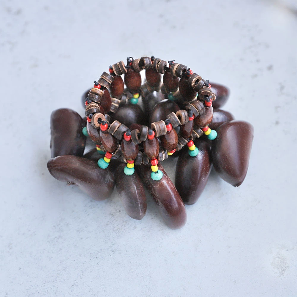 The Agba Instruments Bundle features authentic, seed-based shakers made from traditional West African Agba seeds. The Agba Jute Shaker produces a deep clack, while the Agba Seed Cluster offers softer tones. The Wrist and Anklet Shakers, fitted with elastic bands and colorful beads, add rhythmic movement to dance and play. Designed for drummers, dancers, and sound therapists, these instruments respond to every gesture with natural earthy sounds.