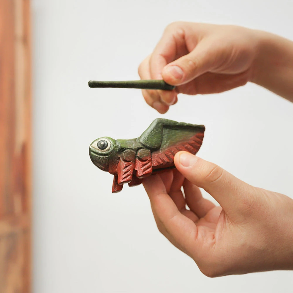 The Cricket Guiro & Stick is a green cricket guiro wooden block, and is a cute woodwind musical instrument that comes with a small matching green stick. Each percussive cricket is handmade, painted and carved. It is played simply by scraping the stick along the indents of the insect, this creates a nice soothing sound. The Cricket Guiro & Stick is a great gift for a child, music lover or it can even be used as a decorative ornament.