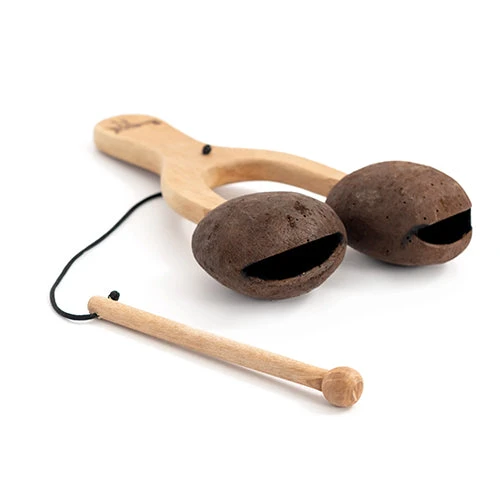 Hold the wooden handle firmly and use the provided beater to strike each husk. The husks produce varied tones and rhythms, making it a simple yet versatile percussion instrument. Experiment with the intensity, pattern and rhythm for different sounds.