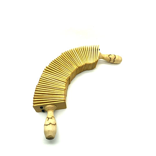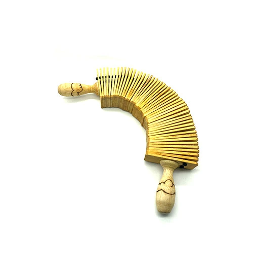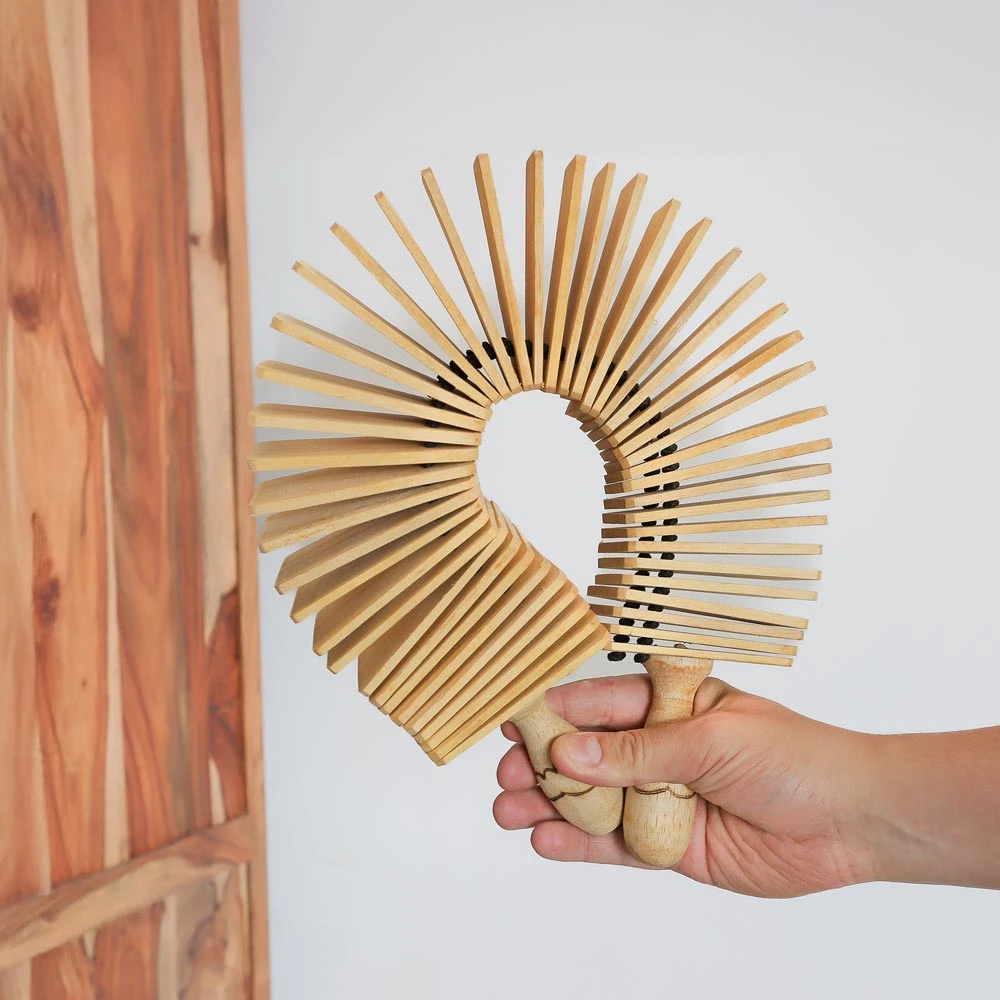 Discover the classic kokoriko percussion instrument from Indonesia that was intricately crafted from high-quality pine wood featuring two handles and plenty of wooden slats that clack together to produce a unique sound.