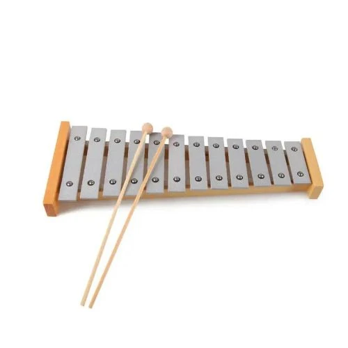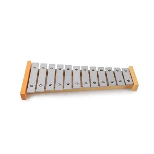 Use the mallet provided to strike the metal bars. Each bar produces a different pitch, allowing for simple melodies and scales to be played.