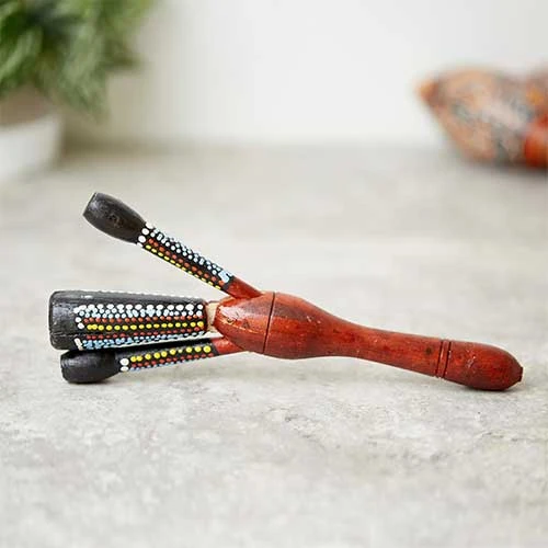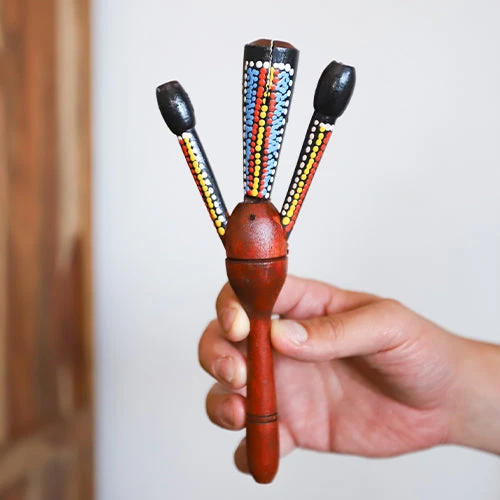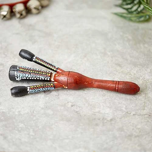 The Penebel Clacker is easy to play and used to be known as the wild man clacker but as the painted design changed so did the name. This Penebel Clacker musical instrument produces a pock sound that is similar to a door knocker or wooden claves. These clackers come in various dot painted designs that feature hues of blue, white, red and yellow.