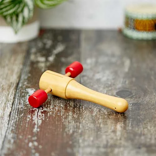 Hold the shaker by its handle and move it back and forth to create a clacking sound. The wooden parts strike together to produce rhythmic, percussive effects.