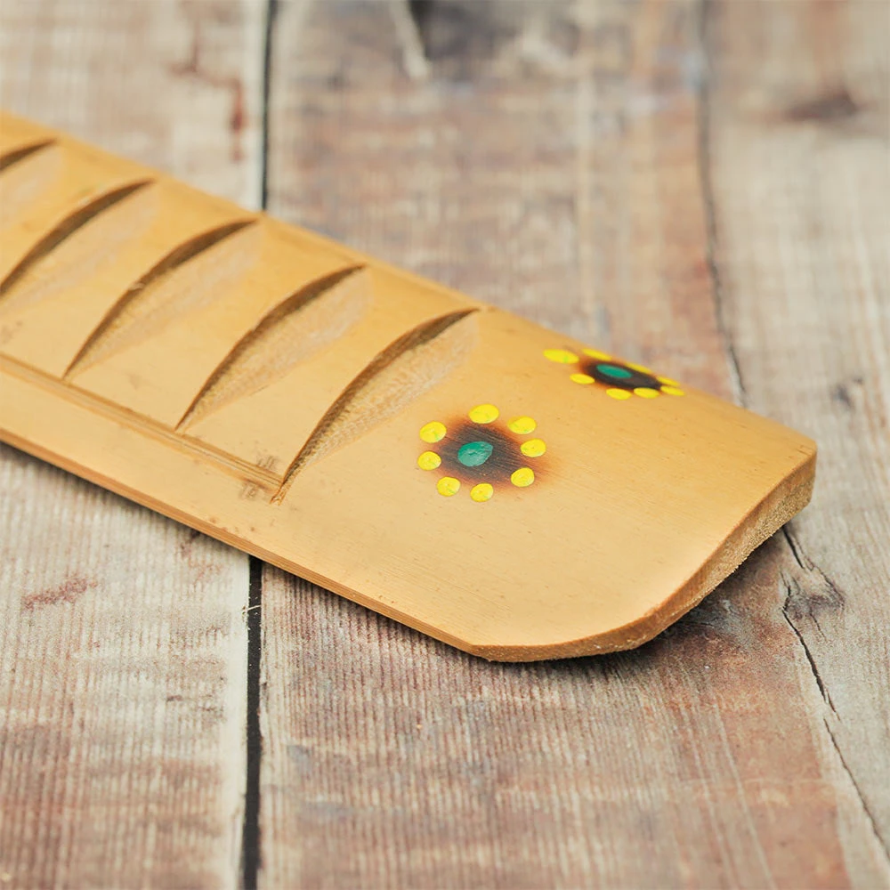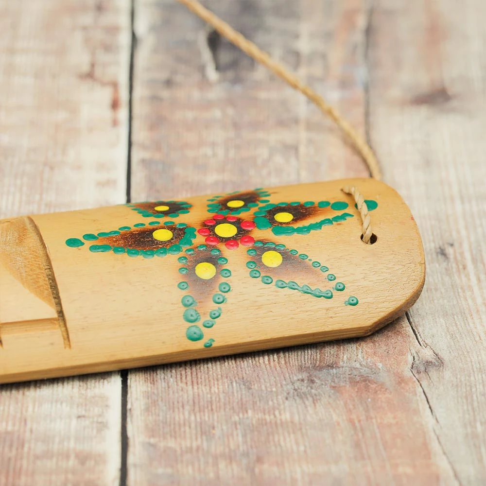The rustic Rumbai Guiro is hand crafted In Bali from a sliced bamboo cane and comes attached to a bamboo stick which is used to play it. This musical instrument has a stunning floral dot painted design with burnt etching and features many different colours. To play the instrument you have to scrape the stick across the chunky ridges of the guiro to produce a rasps sound. The stick can also be tapped on the base to create a similar sound to the claves.