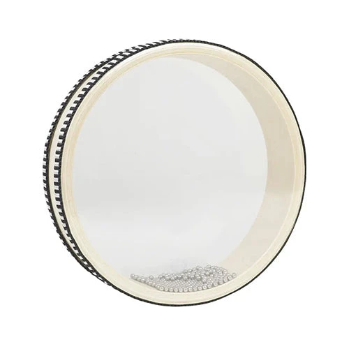 The Shiro Ocean Drums comes in various sizes and is made from plastic making it suitable for vegans and vegetarians. It has metal balls inside that produce the ocean wave sound, the white edge contrasts perfectly with the black ribbon trim. The loud drum can be played as an ocean drum as you slowly shift it from one side to the other, it can be shaken or can be played as a percussive drum. The clear plastic hide allows you to see right through which means that you can easily see the beads inside as the move around.Â