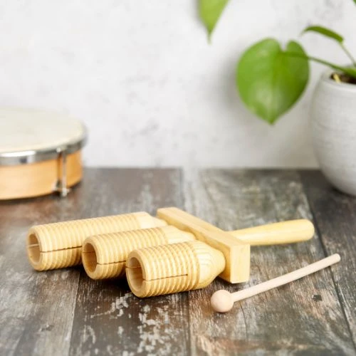 Hold the handle and strike each block with the stick provided, or scrape the guiro section to create a croaking sound.