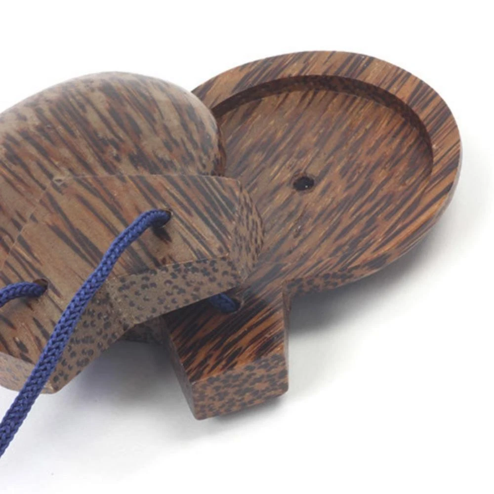 To play the coconut castanet, hold in your hand and clap them together by squeezing your fingers. The natural motion of the fingers causes the two halves to strike each other, producing the distinct clicking sound.