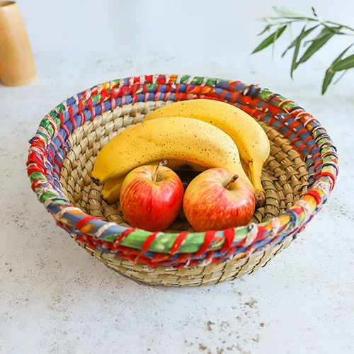 The multicoloured striped design on this stunning Zulu Fruit Bowl has been handmade from straw. The Zulu Fruit Bowl has been made by a hand woven process that involves intertwining threads and fibres to a pattern and design. These Zulu bowls are perfect for keeping around the house to hold fruits, jewellery, craft material and even keys. Each one is uniquely made in an assortment of colours and come from Africa.